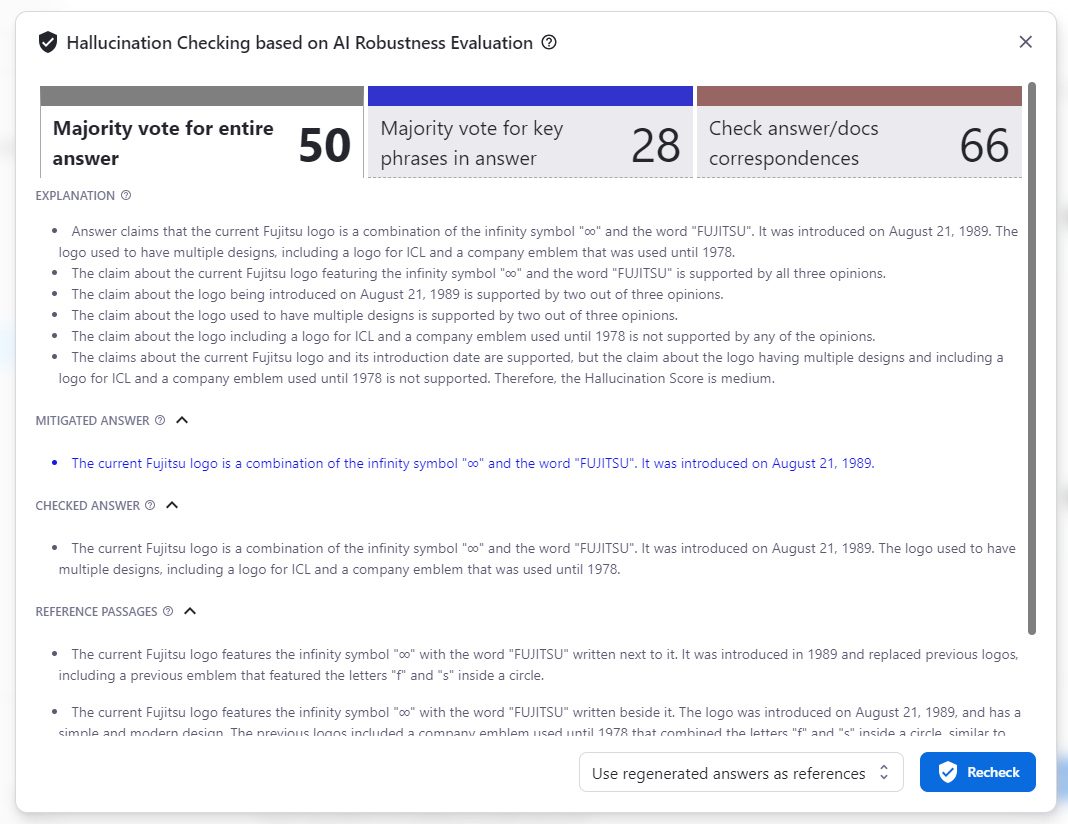 - If the previous hallucination detection result is to be overwritten, Recheck button will appear instead.