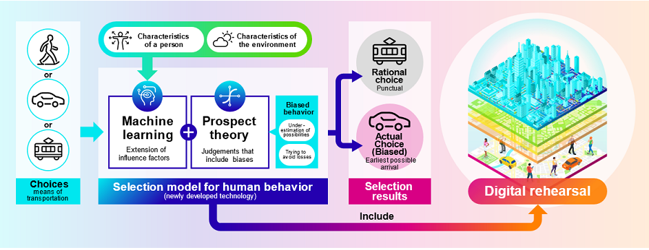 Fujitsu has developed the Behavior Choice Model , which accurately replicates people’s movements within a Digital Rehearsal.With a unique technology that combines prospect theory, one of the leading theories in behavioral economics, with machine learning, the Behavior Choice Model can express the difference in choices between individuals while maintaining behavior characteristics that are common to many people.