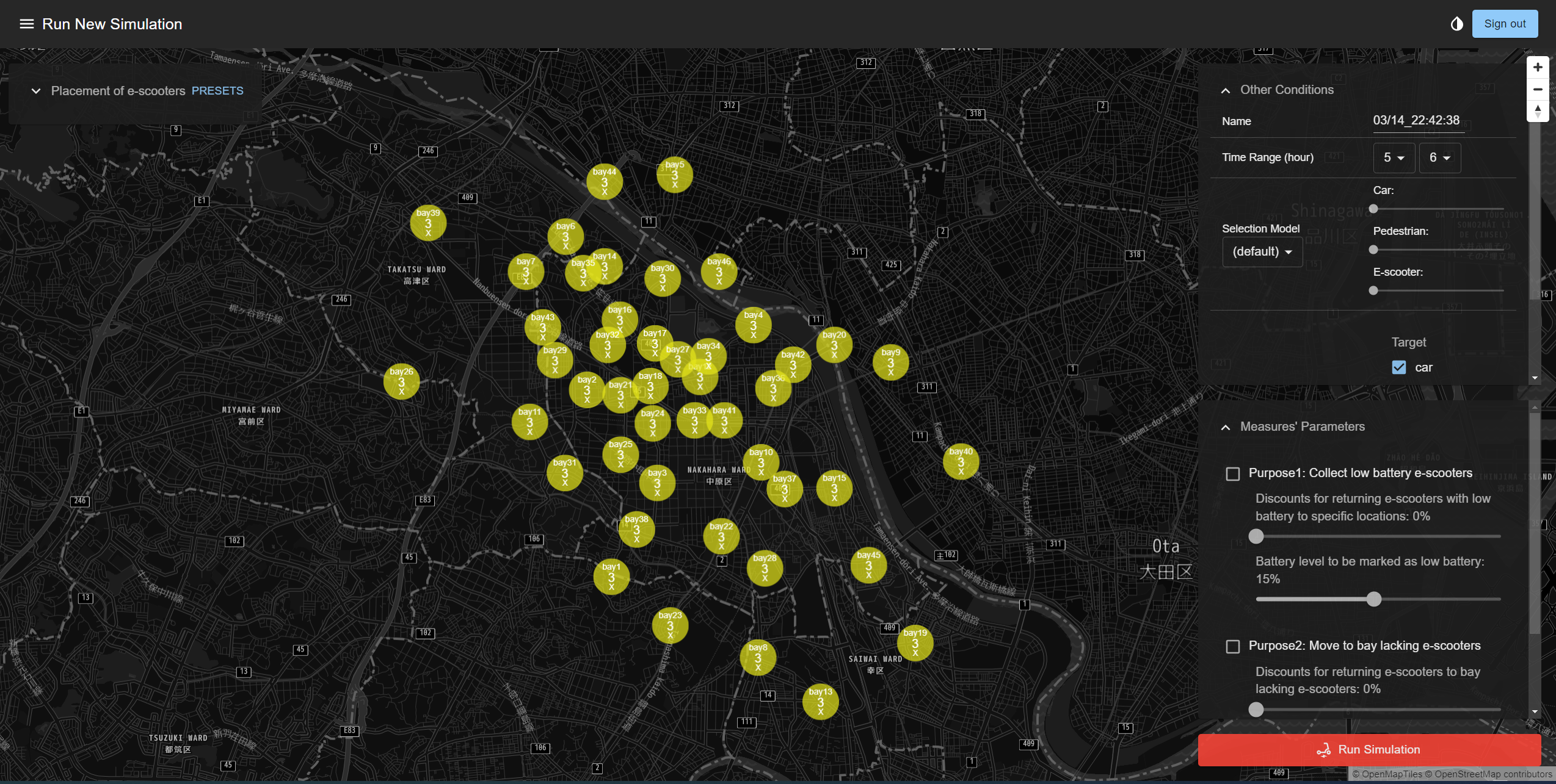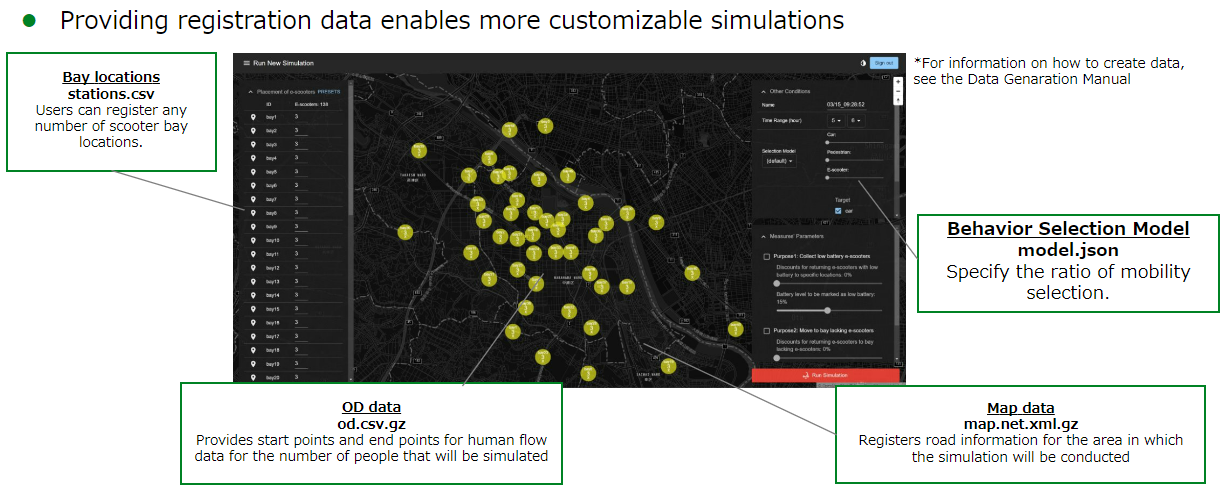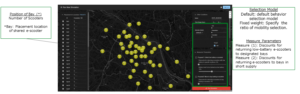 - We have prepared a Digital Rehearsal experience Demo App that enables users to assess the differences in the effects of various measures upon implementation by virtually deploying a shared mobility* virtually in a city