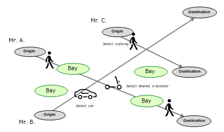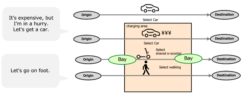 The Behavior Choice Model selects a mode of transportation using the assessment value (time, cost, etc.) of each method of movement (walking/car/shared e-scooter) from the origin to the destination, and the human object moves based on the selection.