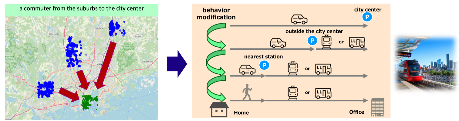 - How can we set rates for which parking lots to increase public transportation use and effectively reduce CO2? By examining measures to encourage commuters to change their behavior (incentives such as parking fee changes), we will promote park and ride for people commuting from the suburbs to the city center.