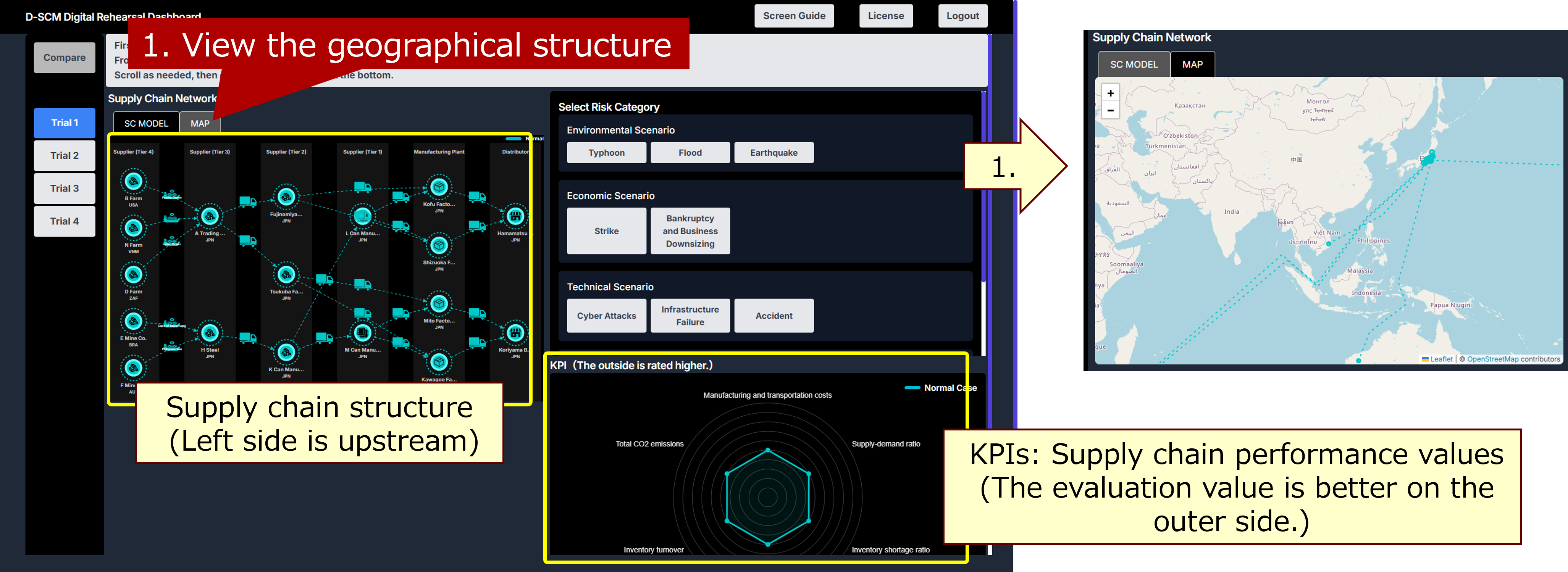 The left side displays the structure of the supply chain. You can view its geographical structure by using the “MAP” tab at the top (1). The bottom right displays supply chain performance values (KPIs), where higher values indicate better performance. The six KPIs are: Cost, Supply-Demand Ratio, Inventory Shortage Ratio, Maximum Lead Time, Inventory Turnover, and Total CO2 Emissions.
