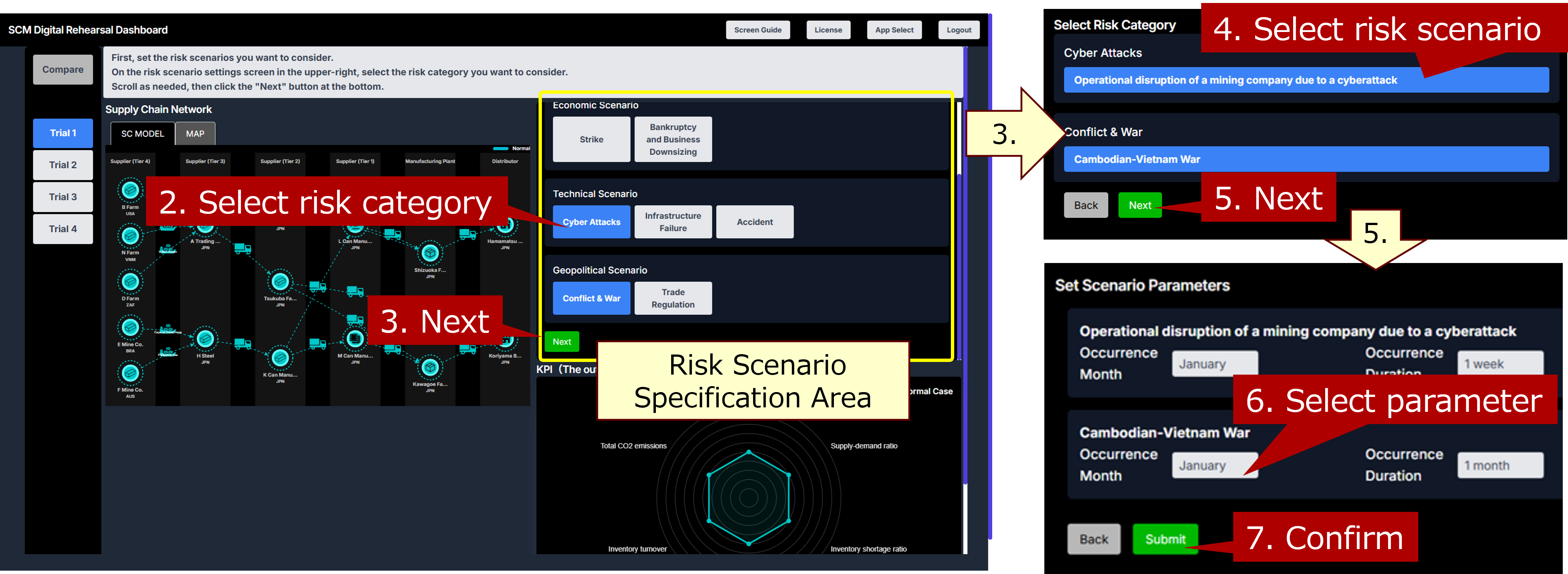 Specify the details of the risk scenario in the upper-right panel. You can specify risk scenarios in the following order: risk category (2-3), predefined risk scenarios for each category (4-5), and parameters such as the timing and scale of risk occurrence (6-7). Multiple scenarios can be specified as needed.