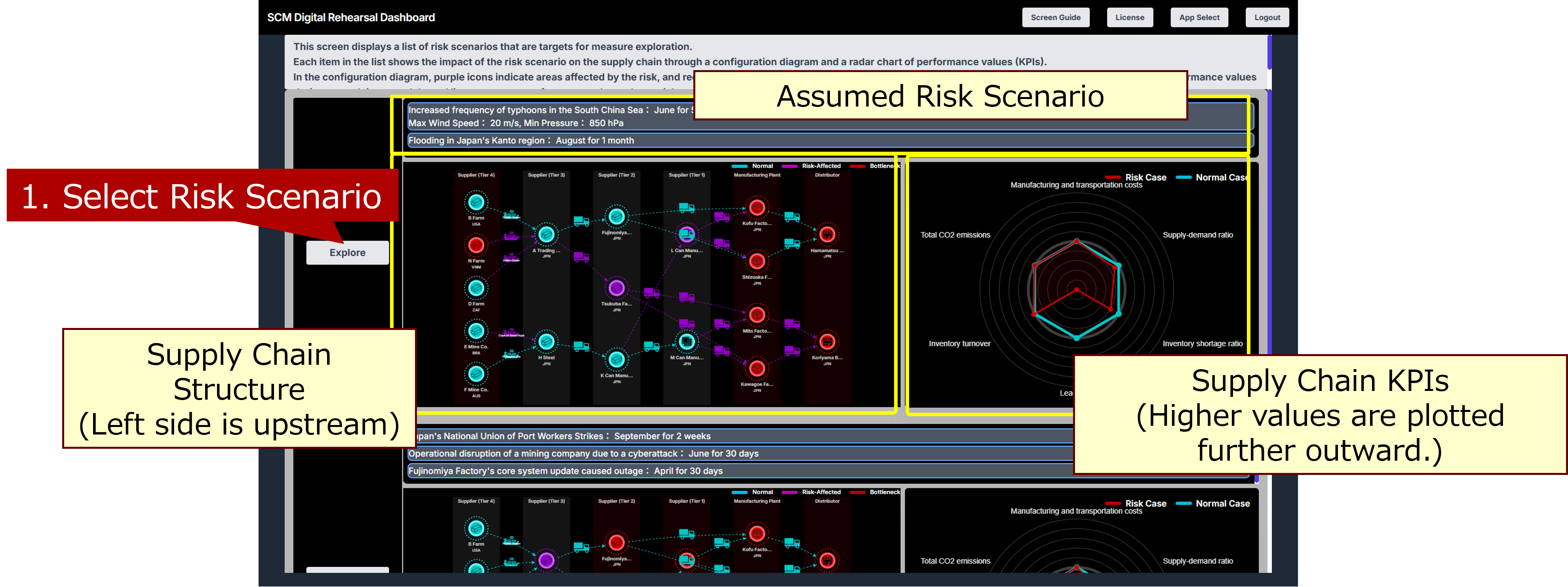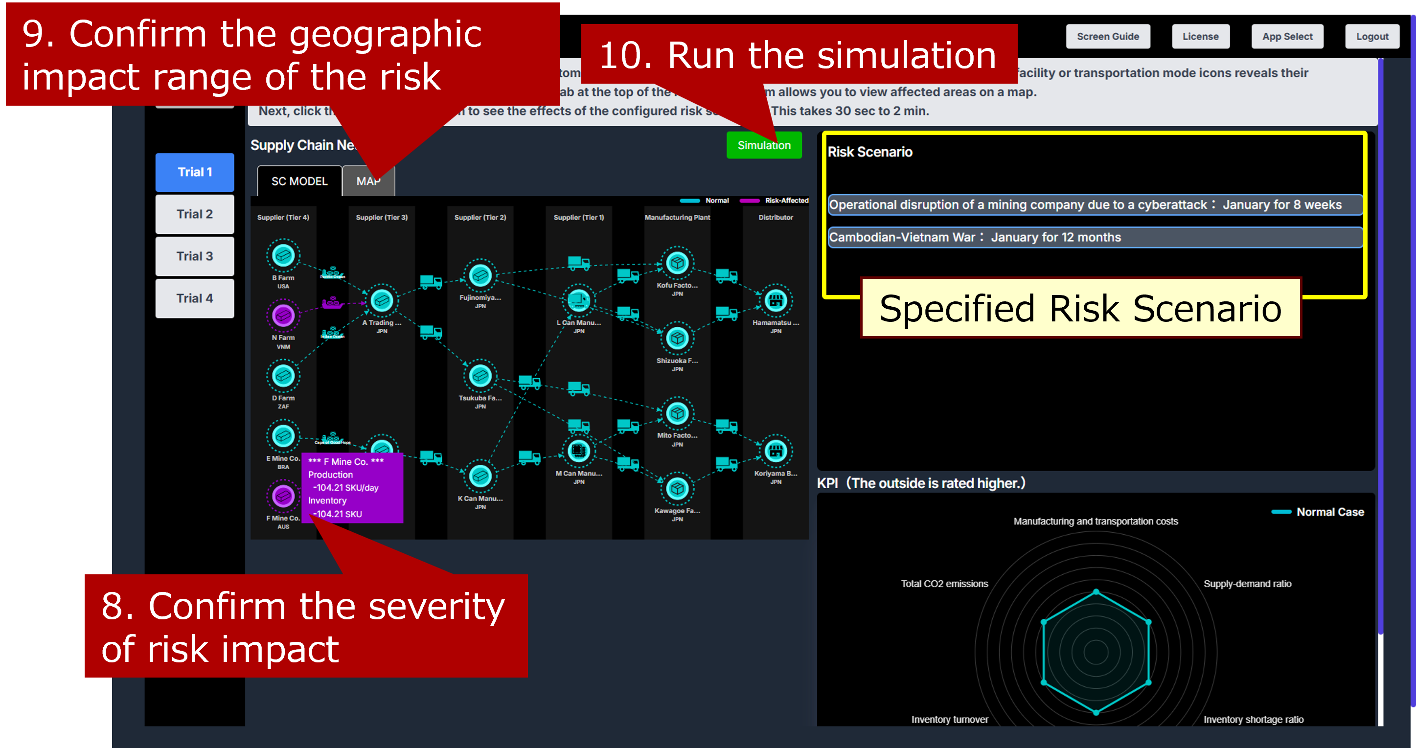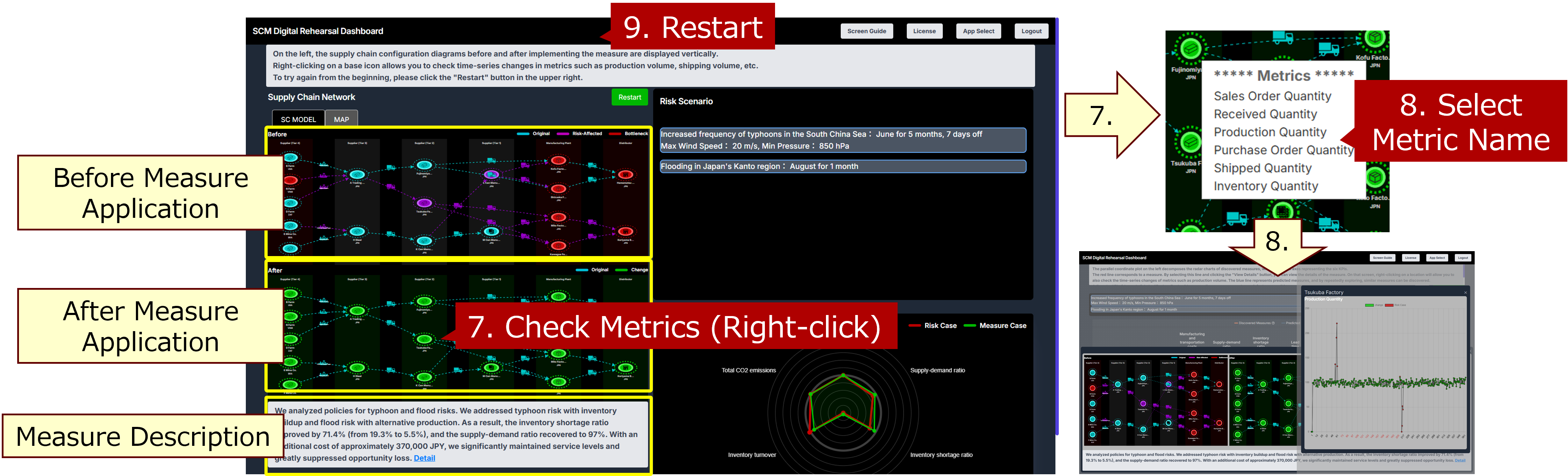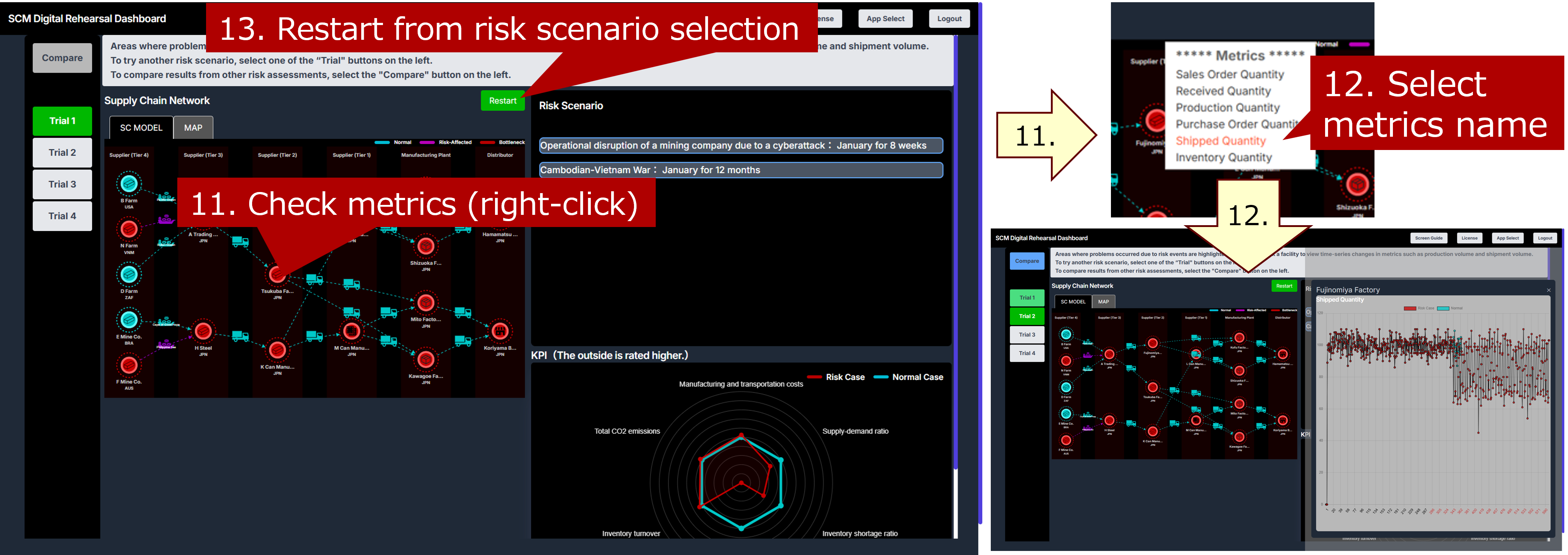 Areas affected by risk events are highlighted in red. The radar chart in the lower right shows normal KPI values in green and risk-affected KPI values in red. Right-click a base icon in the configuration diagram to view metrics such as production volume and shipment volume (11-12). Clicking the “Restart” button in the center allows you to restart the process from selecting the risk scenario (13).