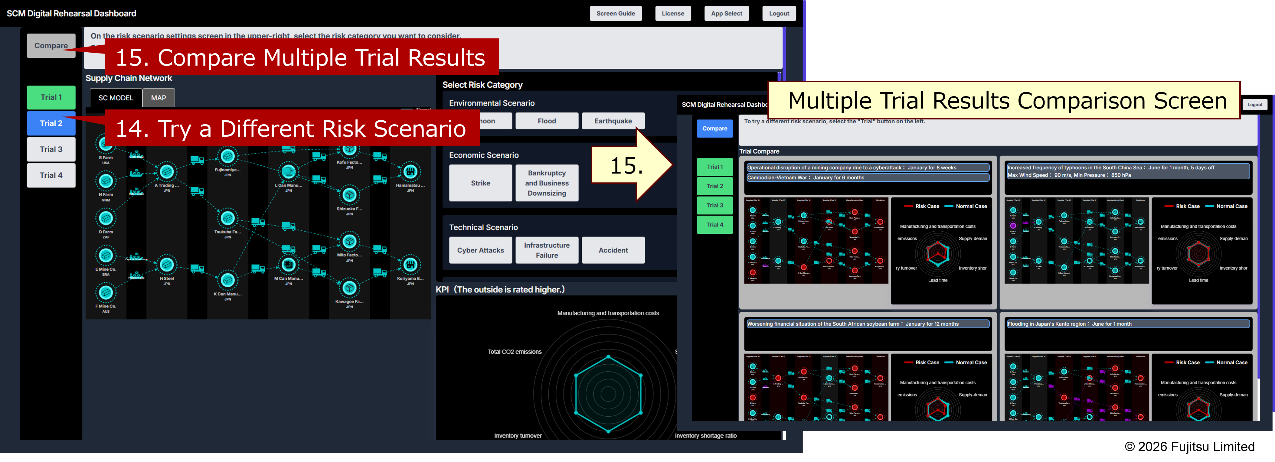 To try a different risk scenario, select the “Trial” button on the left (14). Subsequent operations follow the steps described from "1. Understanding the Normal State of the Supply Chain" to "4. Reviewing Simulation Results". Assessment results that have not yet been calculated appear gray, while calculated results appear green. If you have performed two or more trials, you can compare the results using the "Compare" button (15). Up to four assessment results can be compared simultaneously.