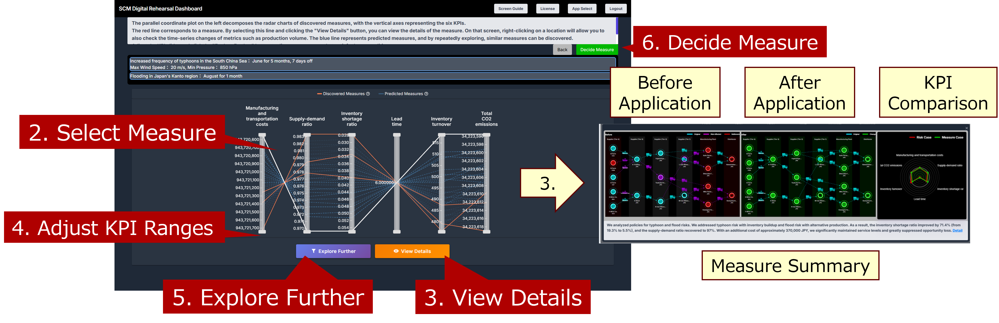A blue polyline represents a predicted measure; repeatedly exploring will help discover similar measures. Adjust the KPI sliders (4) to the desirable range and click the “Explore Further" button (5) to discover additional countermeasures that satisfy the specified conditions. If all possible measures have been explored, the “Explore Further" button will not appear.