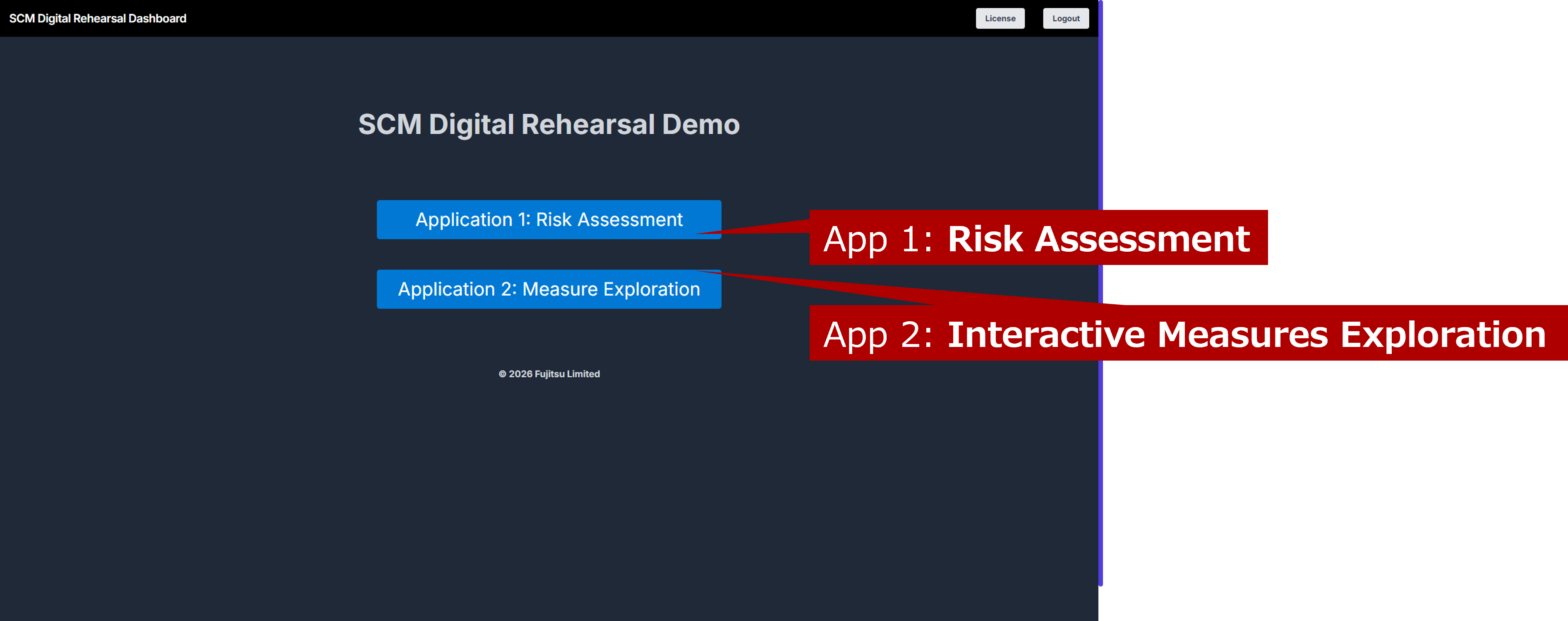 Clicking the "Demo App" button at the bottom of the "Robustizing Supply Chains" technology description page on the Fujitsu Research Portal will display the following app selection screen.