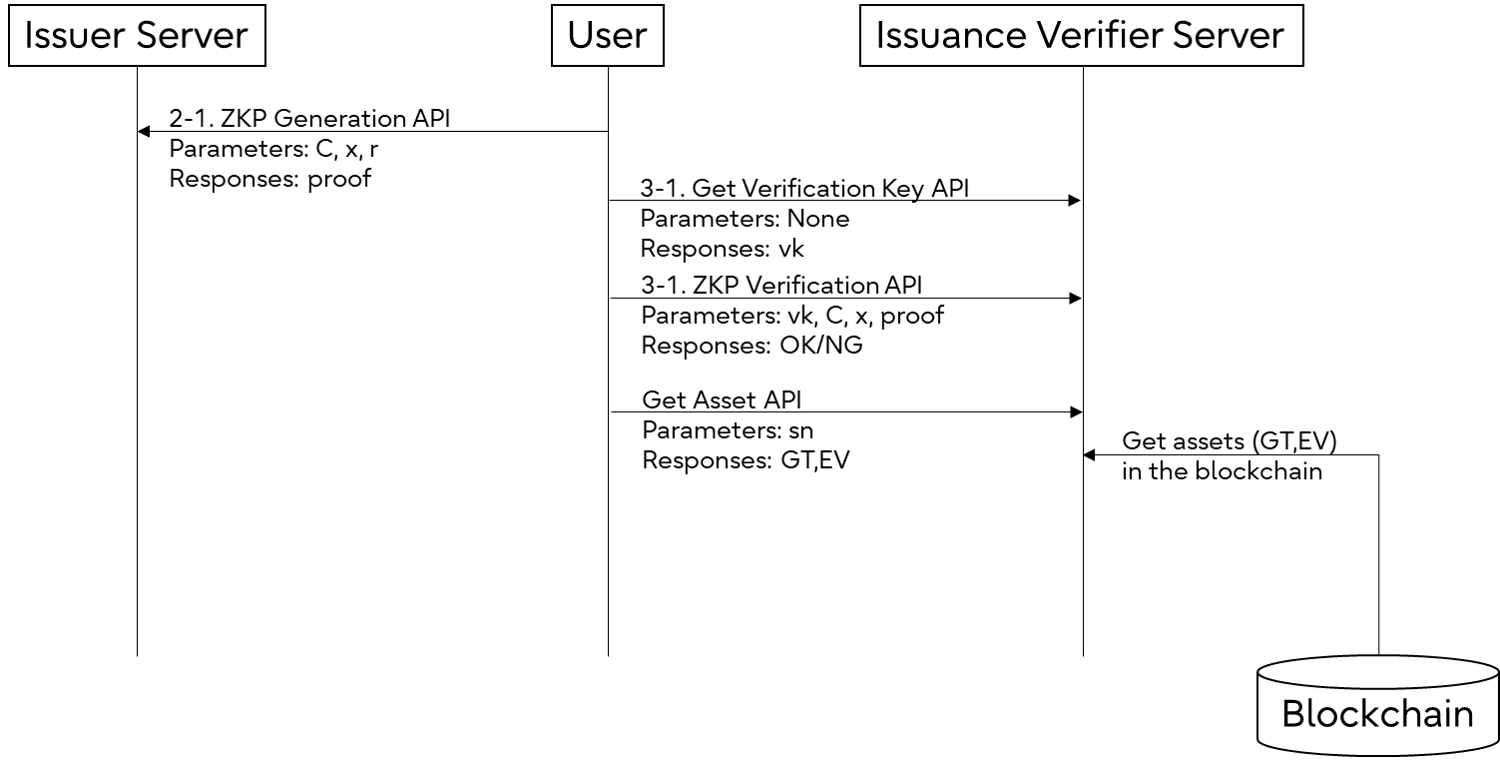 The above APIs allowed the issuer to keep an anonymized transaction of "the issuer passed x to the holder" in the ledger. Next, let us see APIs which enables to prove that "the issuer passed x to the holder", which may execute as in the following sequence.