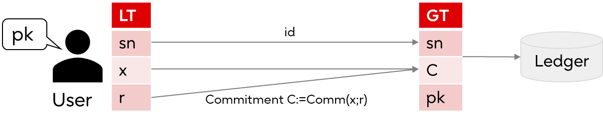 - Creates a local token LT = (sn, x, r) and a global token GT=(sn, C, pk) corresponding to the serial number sn and the raw data x.